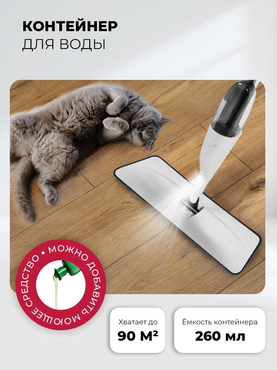 Швабра оснащена контейнером для воды, что упрощает процесс уборки и делает его более удобным, поскольку не нужно постоянно бегать к ведру. Легкость управления обеспечивается вращающейся насадкой, которая идеально справляется с поворотами и наклонами.