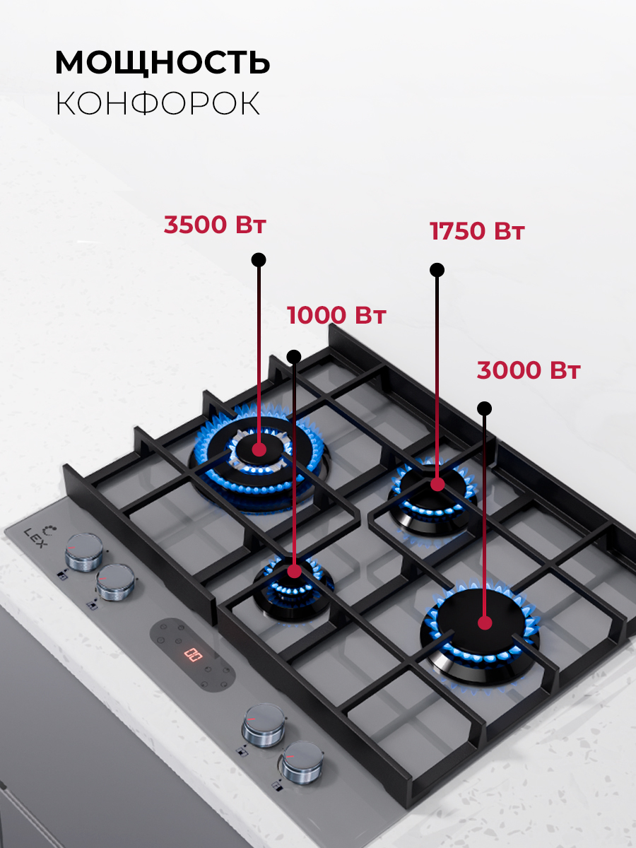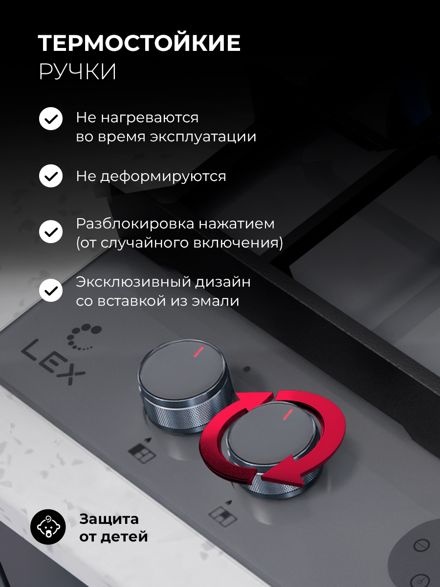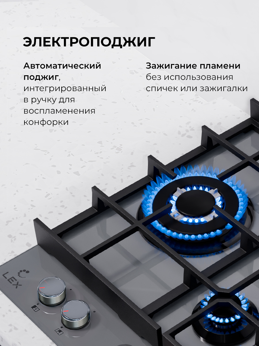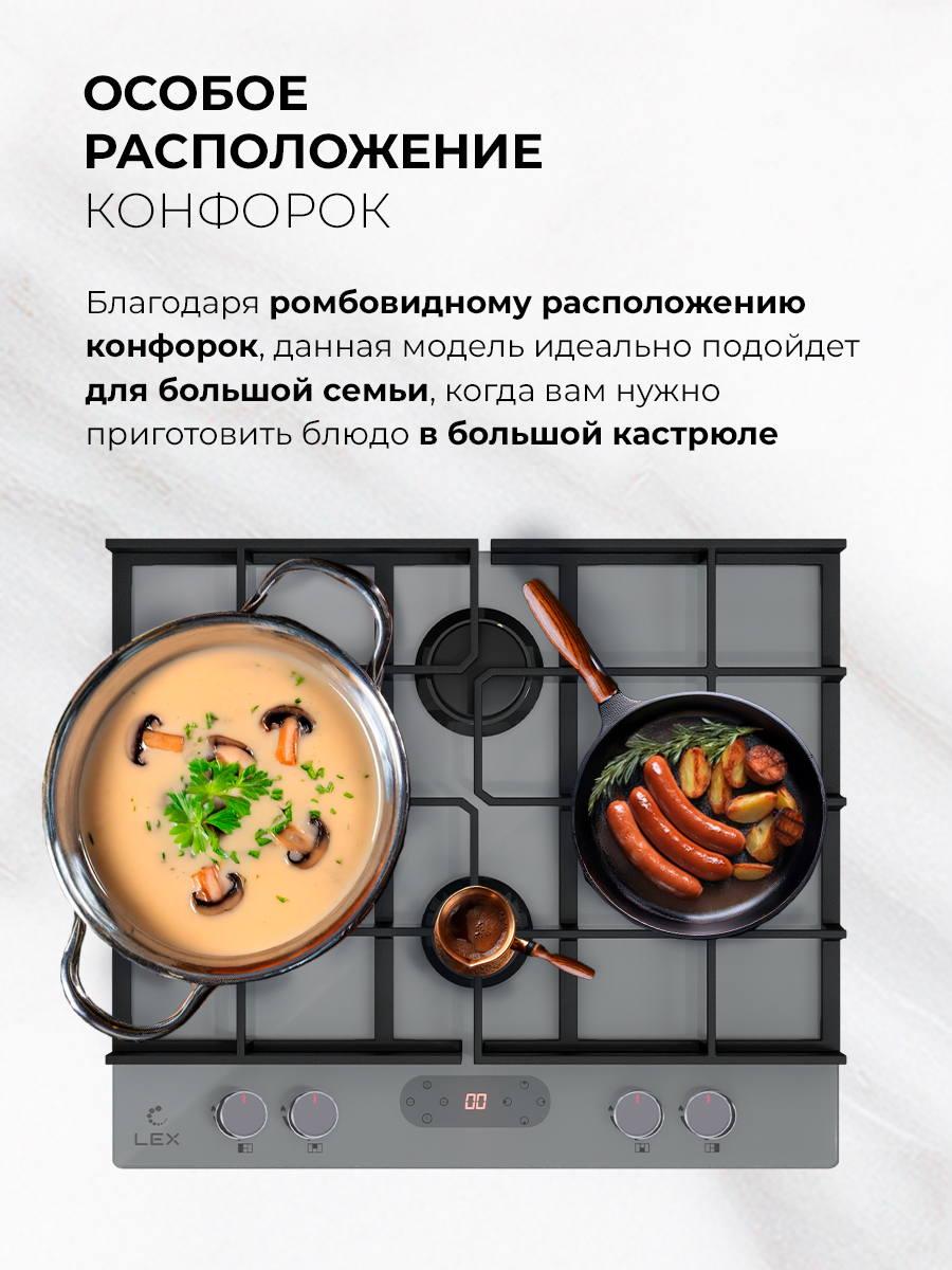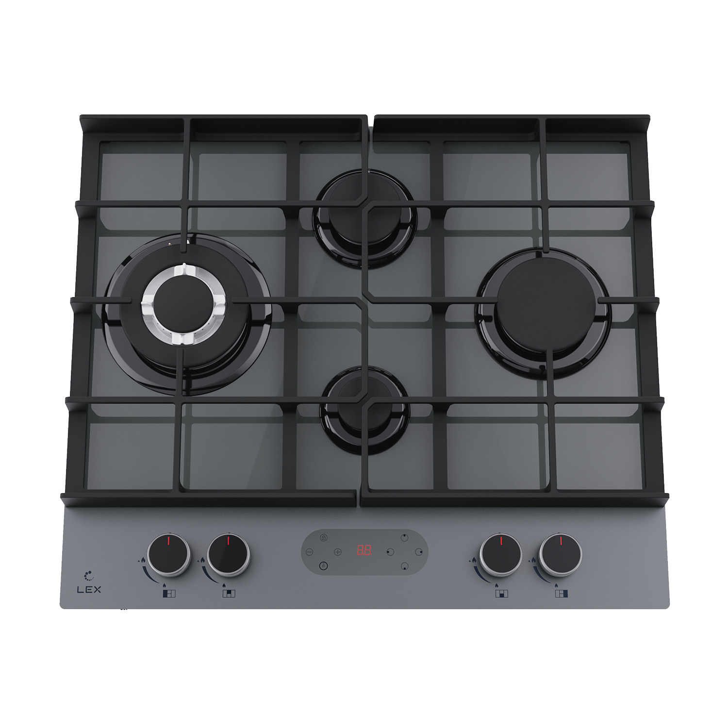 GVG 644T M — первая газовая варочная поверхность с таймером в линейке LEX. Таймер поможет улучшить результат приготовления, при этом сэкономив ваше время. Мощность конфорок настраивается привычными ручками, а для таймера предусмотрена отдельная сенсорная панель управления с дисплеем. Ее можно заблокировать, чтобы случайно не изменить параметры. Газовая варочная поверхность с 4 конфорками различного диаметра и мощности, чугунными решетками, и рабочей поверхностью из прочного закаленного стекла. Поверхность из ударопрочного, закаленного стекла это не только стильно, но и практично. Закаленное стекло не впитывает загрязнения, его легко мыть и с годами ваша поверхность не потеряет свою привлекательность. Надежные чугунные решетки не позволят вашей посуде скользить по своей поверхности за счет шероховатой структуры и прослужат вам долгие годы (чугунные решетки не подвержены деформации при воздействии высоких температур, в отличии от стальных решеток). 4 конфорки различной мощности позволят вам использовать для приготовления посуду различного диаметра, а форма решетки подходит даже для приготовления кофе в турке. Поверхность так же оснащена WOK- горелкой. Это горелка увеличенного размера и мощности, снабженная двумя рядами пламени, для более быстрого, мощного и равномерно распределения температуры, что в свою очередь подходит для приготовления разнообразных блюд в том числе и национальных блюд разных стран. За счет равномерного распределения температуры данная конфорка идеально подойдет для томления. Электроподжиг интегрированный в каждую ручку позволит вам включить подачу газа и поджечь конфорку движением одной руки. Каждая конфорка снабжена системой газ контроля, что делает данную поверхность не только стильной и практичной, но еще и максимально безопасной. При затухании огня, система газ контроля автоматически прекратит подачу газа. Варочные поверхности LEX это современно, практично и безопасно.
