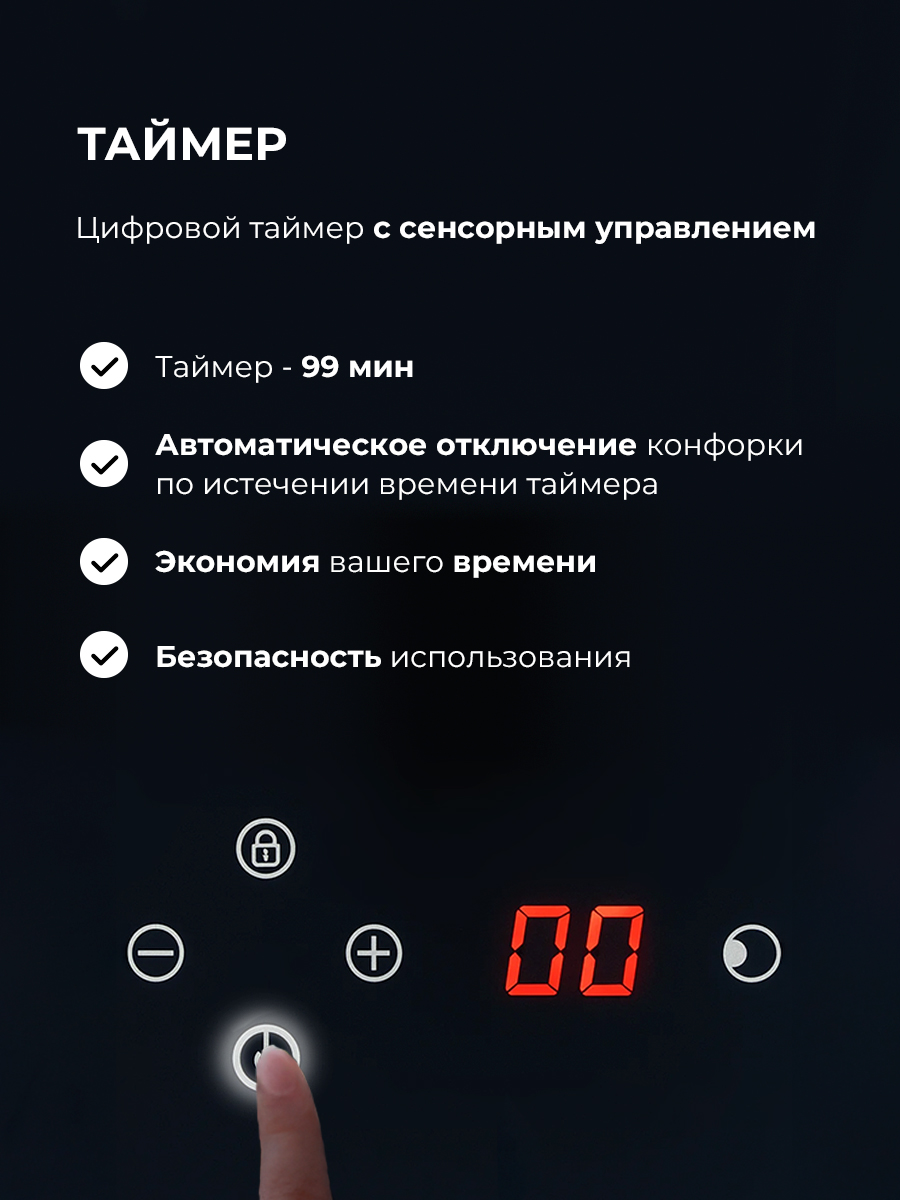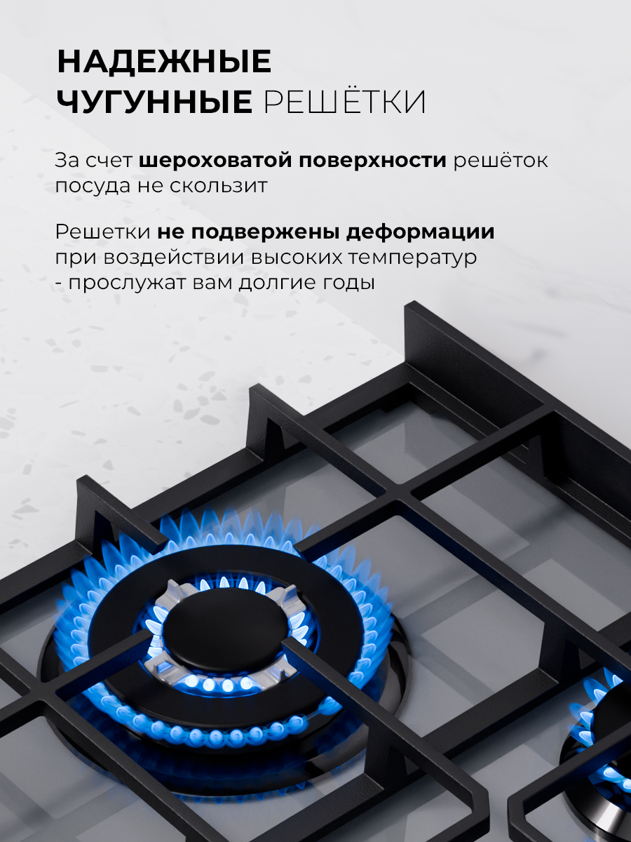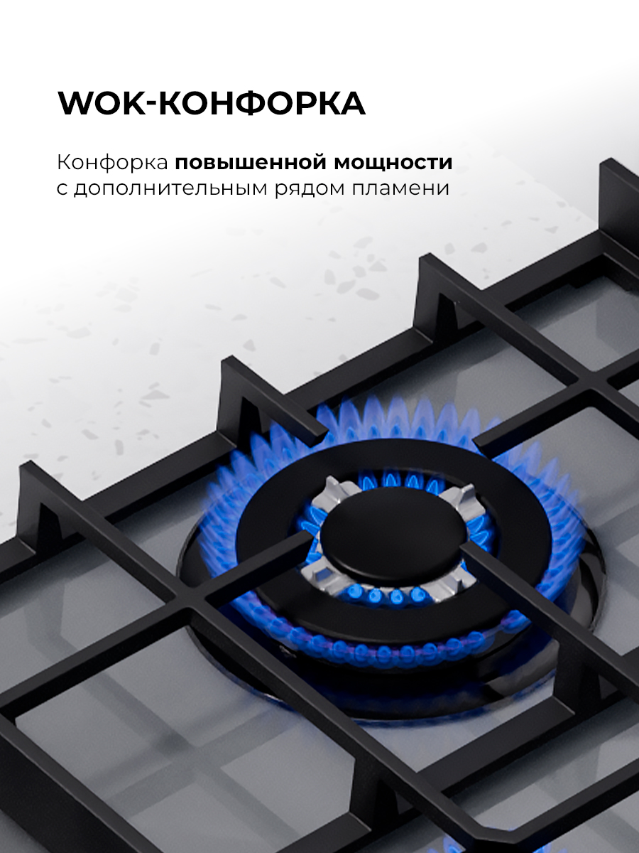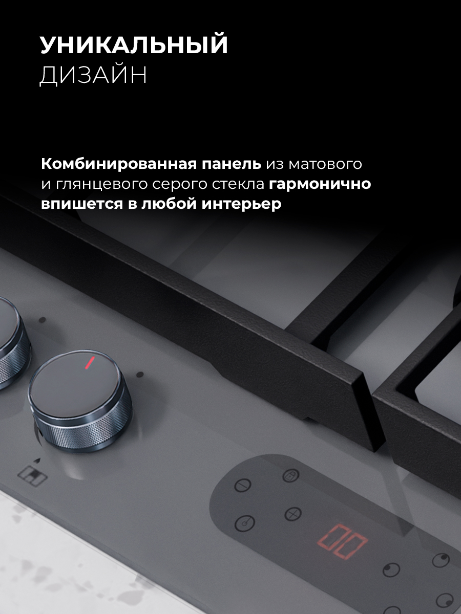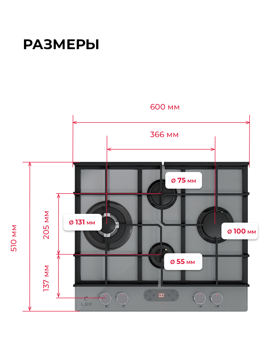 GVG 644T M — первая газовая варочная поверхность с таймером в линейке LEX. Таймер поможет улучшить результат приготовления, при этом сэкономив ваше время. Мощность конфорок настраивается привычными ручками, а для таймера предусмотрена отдельная сенсорная панель управления с дисплеем. Ее можно заблокировать, чтобы случайно не изменить параметры. Газовая варочная поверхность с 4 конфорками различного диаметра и мощности, чугунными решетками, и рабочей поверхностью из прочного закаленного стекла. Поверхность из ударопрочного, закаленного стекла это не только стильно, но и практично. Закаленное стекло не впитывает загрязнения, его легко мыть и с годами ваша поверхность не потеряет свою привлекательность. Надежные чугунные решетки не позволят вашей посуде скользить по своей поверхности за счет шероховатой структуры и прослужат вам долгие годы (чугунные решетки не подвержены деформации при воздействии высоких температур, в отличии от стальных решеток). 4 конфорки различной мощности позволят вам использовать для приготовления посуду различного диаметра, а форма решетки подходит даже для приготовления кофе в турке. Поверхность так же оснащена WOK- горелкой. Это горелка увеличенного размера и мощности, снабженная двумя рядами пламени, для более быстрого, мощного и равномерно распределения температуры, что в свою очередь подходит для приготовления разнообразных блюд в том числе и национальных блюд разных стран. За счет равномерного распределения температуры данная конфорка идеально подойдет для томления. Электроподжиг интегрированный в каждую ручку позволит вам включить подачу газа и поджечь конфорку движением одной руки. Каждая конфорка снабжена системой газ контроля, что делает данную поверхность не только стильной и практичной, но еще и максимально безопасной. При затухании огня, система газ контроля автоматически прекратит подачу газа. Варочные поверхности LEX это современно, практично и безопасно.