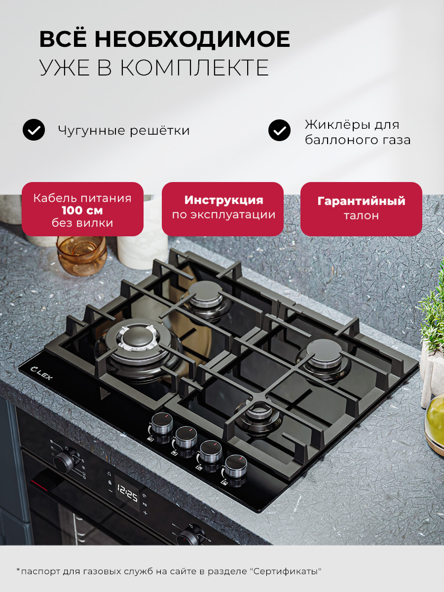Модель GVG 645 BBL — это газовая варочная поверхность с 4 конфорками различного диаметра и мощности, чугунными решетками и рабочей поверхностью из прочного закаленного стекла. Поверхность из ударопрочного, закаленного стекла — это не только стильно, но и практично. Закаленное стекло не впитывает загрязнения, его легко мыть и с годами ваша поверхность не потеряет свою привлекательность. Надежные чугунные решетки не позволят вашей посуде скользить по своей поверхности за счет шероховатой структуры и прослужат вам долгие годы (чугунные решетки не подвержены деформации при воздействии высоких температур, в отличие от стальных решеток). 4 конфорки различной мощности позволят вам использовать для приготовления посуду различного диаметра, а форма решетки подходит даже для приготовления кофе в турке. Электроподжиг, интегрированный в каждую ручку, позволит вам включить подачу газа и поджечь конфорку движением одной руки. Каждая конфорка снабжена системой газ-контроля, что делает данную поверхность не только стильной и практичной, но еще и максимально безопасной. При затухании огня система газ-контроля автоматически прекратит подачу газа. Варочные поверхности LEX — это современно, практично и безопасно.
